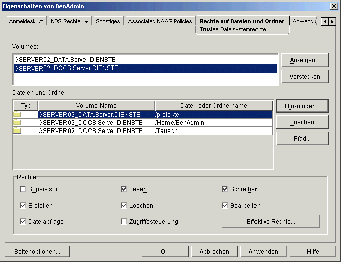 | Eigenschafts-Rechte | alle Rechte bis auf Supervisor | |
