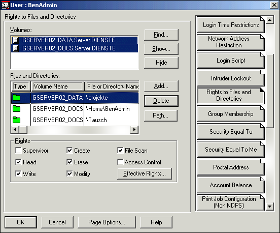 Damit ein anderer Benutzer als der Admin (hier der BenAdmin) überhaupt genügend Rechte hat, um mit BImport Benutzer mit diversen Eigenschaften (z.B. Volume-Restictions auf NSS-Volumes) zu erzeugen, muss der Admin ihm einige Rechte geben. Nach momentanem "Forschungsstand" sind dies: